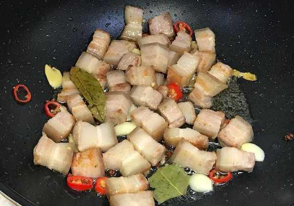 接着下入控净水分的五花肉进行上色,然后翻炒均匀再放入葱姜蒜、辣椒和香叶,继续翻炒。