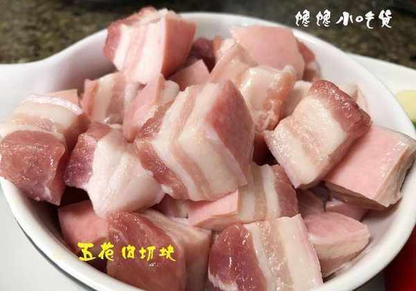 首先我们把买回来的五花肉清洗干净,然后把洗干净的肉放到菜板上,接下来我们就开始切块,然后放入盘子中备用。小贴士:先将肥肉蘸凉水,然后放在案板上,一边切一边洒点凉水,这样切肥肉省力,不易粘案板,肉也不会滑动。