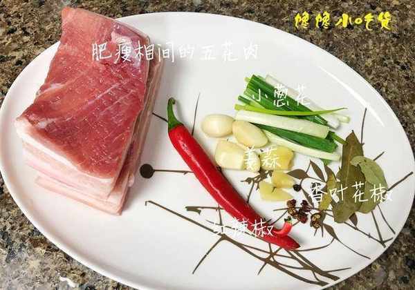 在做菜开始的时候呢,咱们首先要选择一些今天需要的食材,看到下面的盘子了吗,里面就是这道菜需要准备的,肥瘦相间的五花肉,红辣椒,小葱花,香叶,花椒,大蒜和姜片。相信经常做饭的人都知道,葱姜蒜是必不可少的调味料呢!