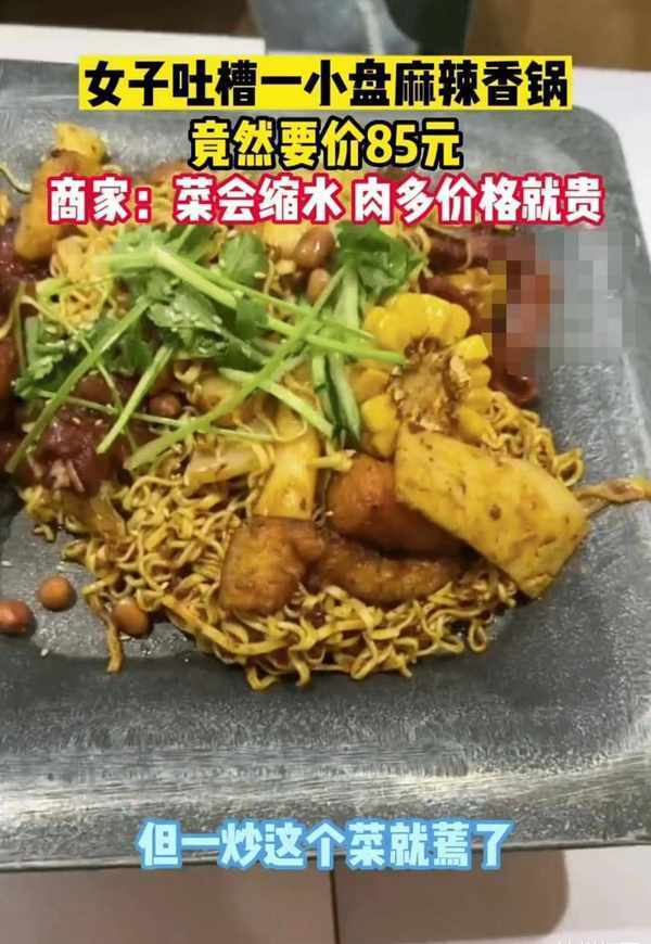江苏,南通。女子去吃麻辣香锅,却很委屈地告诉大家,她花了85元,就端上来一小盘。这时店家也出来澄清说:女子选了一小盆菜来炒,结果菜都炒蔫了,所以看起来分量就少了一点。
