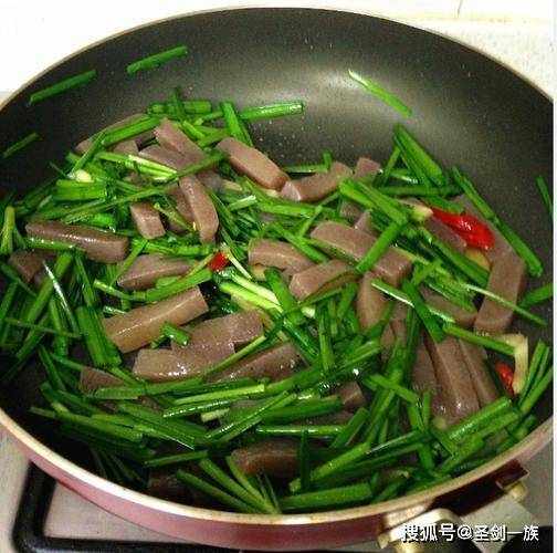 4、再放入韭菜段,翻炒韭菜至微微发软变色,加入少许盐,2勺生抽,大火翻炒韭菜断生即可,出锅装盘,感滑嫩又入味,解馋又饱腹。