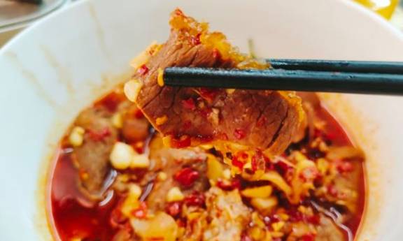大刀牛肉虽然没有做精致的摆盘,不过从颜色上看就能勾起人们的食欲来,切得很薄的牛肉片混合香菜、大蒜、剁辣椒和诱人的红油,作为前菜来开胃在合适不过了。不过不喜欢太油的小伙伴,就要慎重了,因为这一碗牛肉几乎都是泡在油里面的。