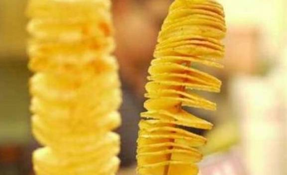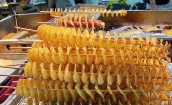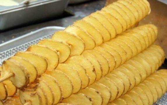 这种小吃兴起于韩国,是当地的一种特色美食小吃,它是由土豆进行加工改良而成,整个过程里将土豆切成螺旋状比较费时费力,还需要一定的技巧与耐心,所以现在做这个的人还比较少,有趣的是,你可以看到它从一颗小土豆变成旋风片的整个过程,消费者还是比较喜欢这种新奇有趣的东西,动手能力强一点的回家可以自己试着做一做