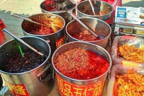各种口味的辣椒酱、咸菜,辣酱又香又辣,特别受欢迎,价格也很公道,8块钱一斤。很下饭的。有没有被馋到?