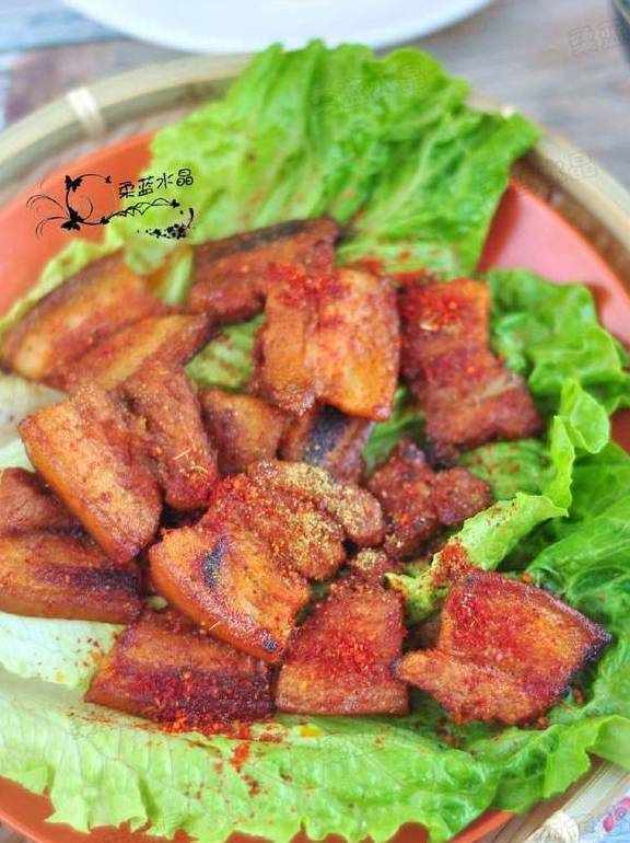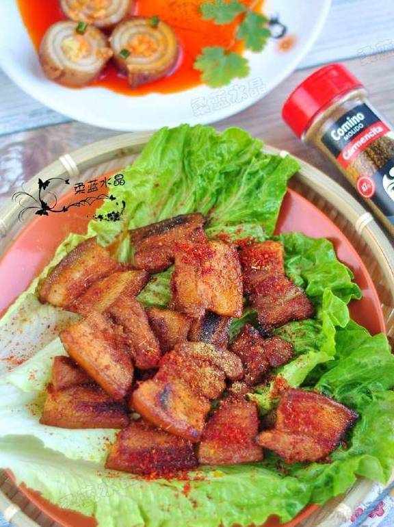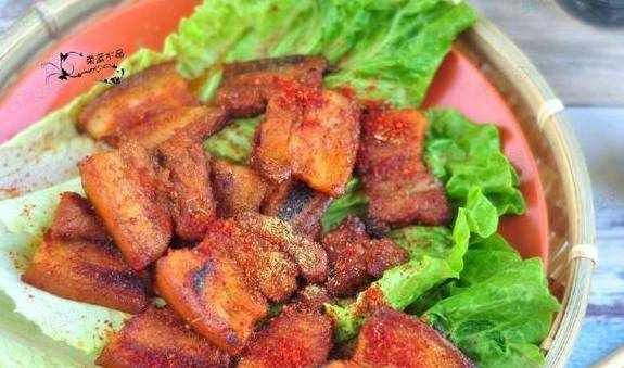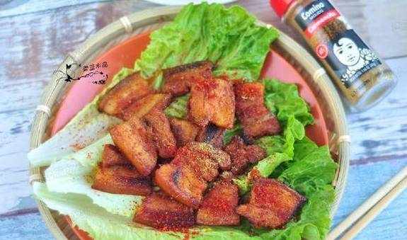 4..盘子里铺好生菜,摆五花肉,撒孜然粉,再撒上辣椒面。吃的时候,可以用生菜将肉卷起。如果喜欢吃碳烤味的,可以把锅底烧焦后继续烤肉,不过比较毁锅子,可以用不想要的锅试试。