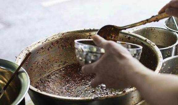 油辣子做好了,就可以开始打面佐料了,一小勺猪油,这是小面如此飘香的秘诀~