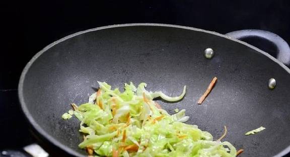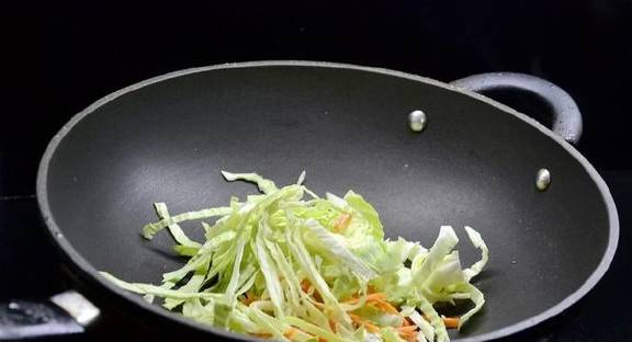 2.热锅倒油,爆香大蒜后,将圆白菜和胡萝卜丝一起放入翻炒片刻
