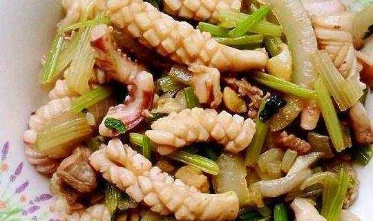 将买回来的生鱿鱼,用水卤熟。将切好的芹菜段,姜葱蒜用油煎炒下,起锅。烧好锅,下油,将滴干水的鱿鱼倒进去,翻炒后,到芹菜放进去炒一起炒,调好味就可以起锅了。soeasy!