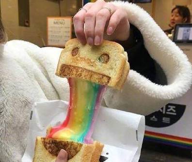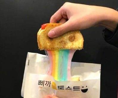 不过脏脏包才流行了没多久,韩国就发明了一款彩虹包,看上去比脏脏包好看很多,颜值上就赢了脏脏包,掰开之后中间的芝士是彩虹色的,很多人都感觉有点像五颜六色的彩虹样融合在一起一样,不免让人怀疑韩国在模仿脏脏包。