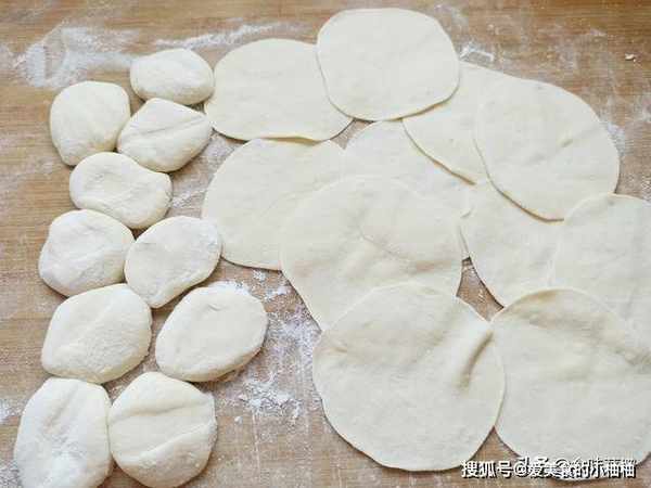 5、案板上撒些干面粉,随便揉搓几下,然后搓成细长条,分成相等的剂子,用掌心正反面按压,擀成中间厚四周薄的饺子皮,这样不易煮破。