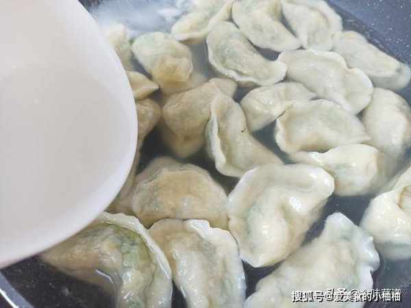 8、水煮开后,下入饺子,一次数量不可太多,用木铲子轻轻擦动锅底,防止粘锅,约3分钟水开后,点入半碗凉水,重复3次,等待饺子全部上浮,肚子鼓鼓的,即可捞出。