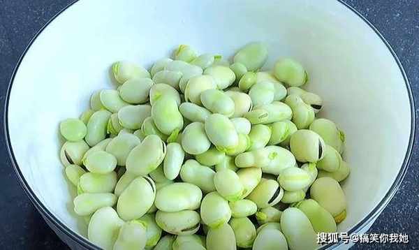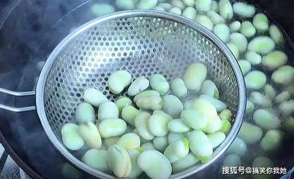 3、胡豆比较硬,比较脆,烧开热水,将它倒在锅中焯水两分钟后捞起。