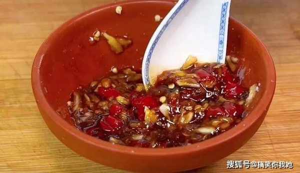 3、然后准备一碗蒜蓉辣椒酱,用蒜末、小米椒混合,倒入热油激发香味,再放食盐,香醋,生抽调味就可以。
