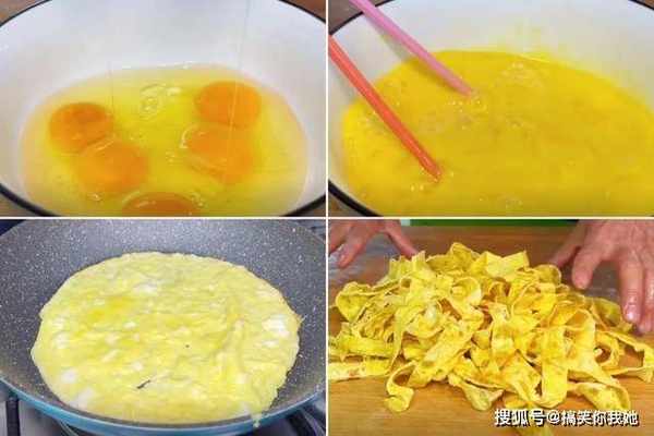 2、接着准备五个鸡蛋,放在碗中,将鸡蛋搅拌成蛋液,然后倒在锅中煎成薄薄的蛋皮,最后再切成丝备用。