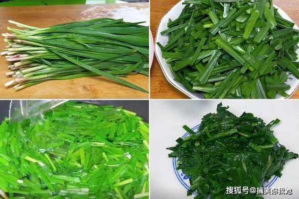 1、首先准备一把韭菜,清洗干净,将韭菜叶和根茎切成小段,分开备用。然后烧开热水,倒入韭菜,将它焯水一分钟捞起。焯水好的韭菜,将它捞起来,挤干水分,放在碗中。