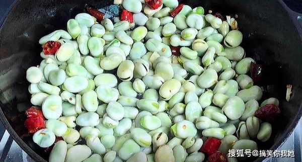 5、接着倒入焯水过的胡豆,翻炒均匀。