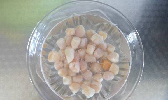 1.温水中加入料酒,将干贝冲洗干净放入水中,泡发2小时左右;