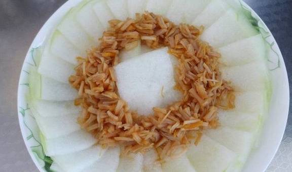 6.将腌制好的冬瓜片,去除水分摆盘,再将干贝丝铺在上面;