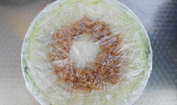 8.取出后,去掉保鲜膜,放上切好的葱花;