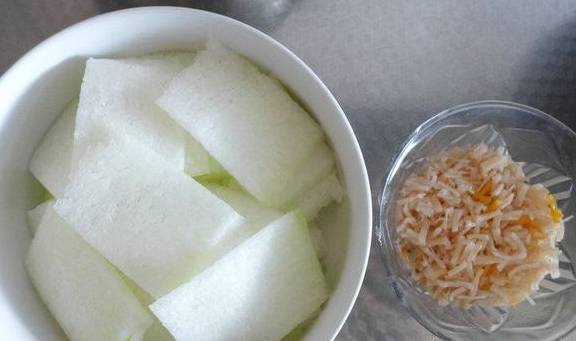 3.将冬瓜切片,泡发的干贝撕成丝;