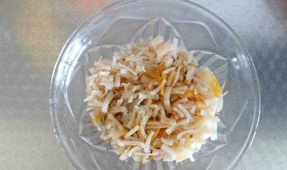 5.在干贝丝中放入酱油、蚝油、胡椒粉和姜汁,拌匀;