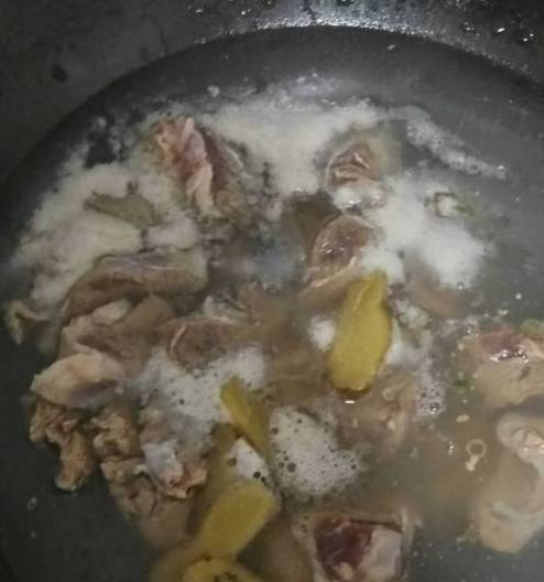 羊肉洗干净后,加盐,姜,除水。去掉白沫。
