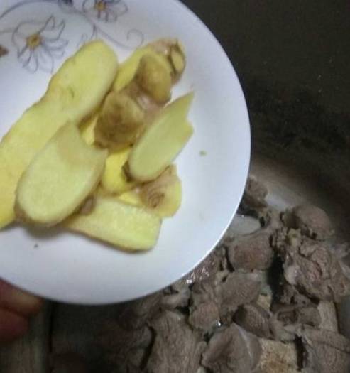 姜切片。羊肉和姜片一起放入锅里