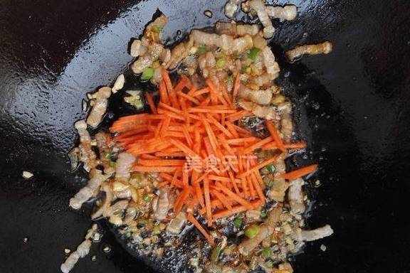 9.加入胡萝卜,胡萝卜属于脂溶性食材,所以要先下胡萝卜。