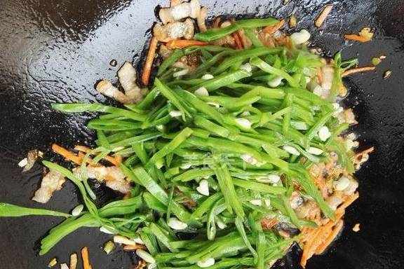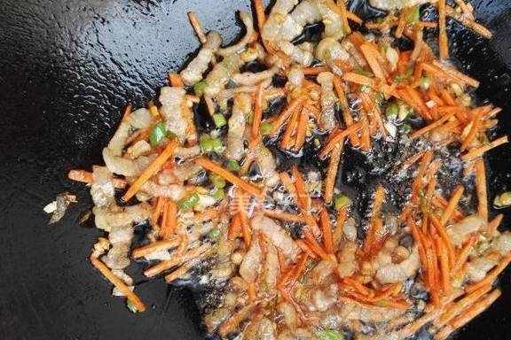 4.猫耳朵切丝,黑木耳切丝,五花肉切丝(要粗一点),胡萝卜切丝,葱、姜、蒜切碎。