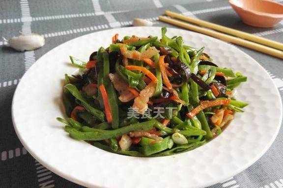 猫耳朵豆角150克、五花肉50克、胡萝卜15克、黑木耳8朵、盐1.5克、葱1段、姜2克、蒜2瓣、料酒4克、生抽6克、花椒粉1克、食用油2克