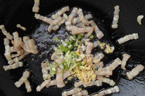 6.小火将五花肉煸出油时,加入葱、姜、蒜碎,炒香。