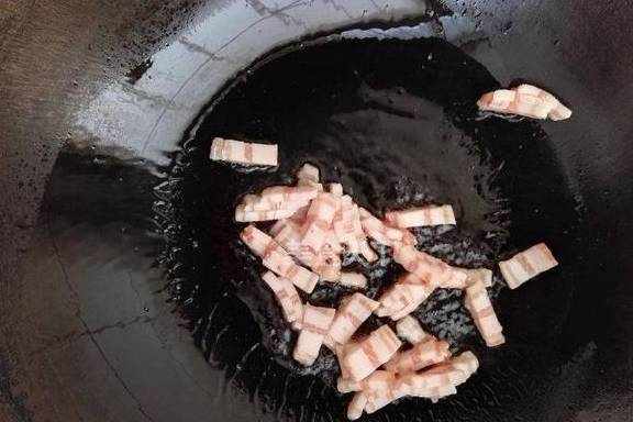 5.锅烧热后加食用油,润一下锅,加入五花肉煸炒。