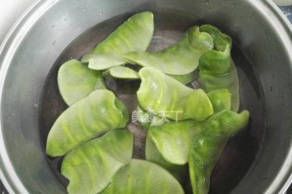 2.猫耳朵择去筋洗净,用开水焯一下,水中加入少许盐,捞出浸泡于凉水中。为了保持蔬菜的漂亮的绿色,可以在水中加入盐少许。