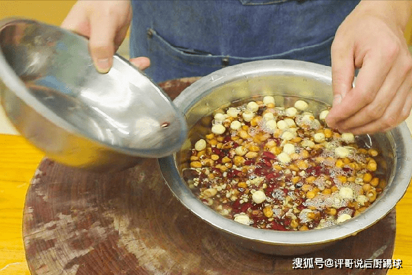 红芸豆、赤小豆、黑豆、薏米、花生、莲子清洗干净挑出坏豆子;江米和红枣一起放入蒸锅内,用中火蒸30分钟,在蒸制江米加水的量没过江米一个指节即可。