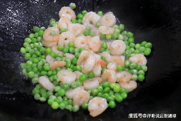 锅内烧油,油温5成热时把控过水分的虾仁、豌豆,和刚刚准备好的料汁一起倒入锅中,开大火颠锅翻炒,食材入味、香味融合以后即可出锅。