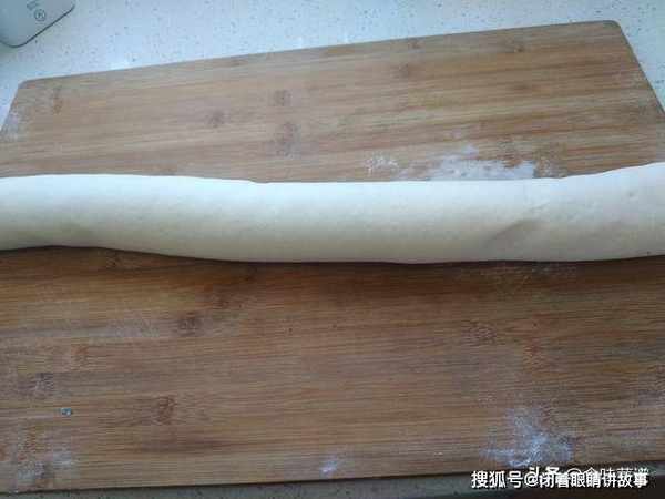 3、醒好的面,放在案板上揉搓排气,分别擀成形状一样的长方形饼,重叠在一起,用手擀成长条,如图。