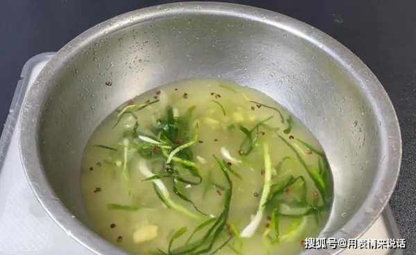 3、然后准备葱姜放大盆中,挤出汁水,加两碗水,放料酒、食盐进去调味。