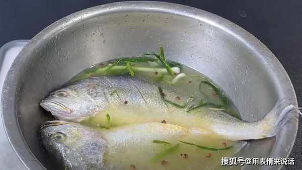 4、随后将黄花鱼,浸泡在葱姜汁中,记得要腌制2小时,才会入味,去掉腥味,鱼肉变得更软嫩。