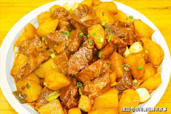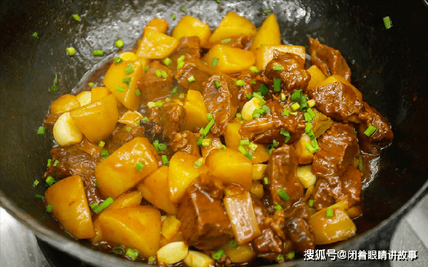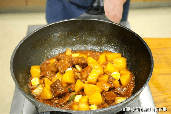 煮熟后牛腩切大块,锅里烧油葱姜粒爆香,再放入少许八角 、香叶 、桂皮 、陈皮 、花椒,增加肉的底味。倒入牛腩加一点老抽上色,蚝油稍微多一点提鲜。大火翻炒至上色,加点番茄酱和几勺煮肉的原汤。之后加鸡粉、胡椒粉调味,把土豆也加进去一起炖。