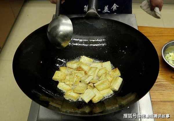 煎豆腐的时候,撒上食盐进一步防止粘锅。还能增加低味,把豆腐均匀铺在锅底,中小火慢慢煎,经常摇晃锅勤翻面,这样受热更加均匀,大约煎3分钟,豆腐煎至两面金黄以后即可出锅。