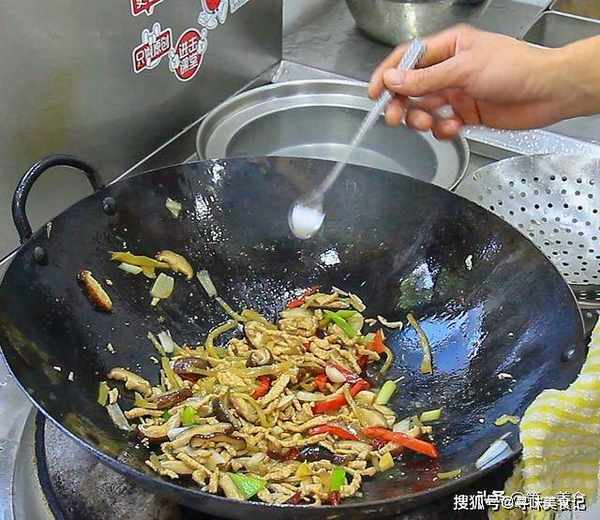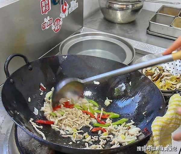 锅内烧油,充分滑锅后倒出热油,倒入凉油,热锅凉油是为了防止肉丝粘锅,放入切好的肉丝,用勺子快速翻炒。