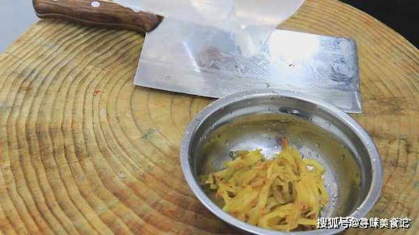 榨菜疙瘩一个,切成细丝放在盆中,用清水浸泡去一下咸味。