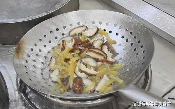 迅速的把榨菜丝倒出用清水反复冲洗几次,香菇焯水一分钟左右,放入冲洗干净的榨菜丝。