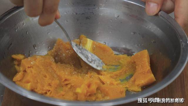 蒸好后,把南瓜盛出放入盆中,放入3克白糖, 然后用勺子按压成南瓜泥。
