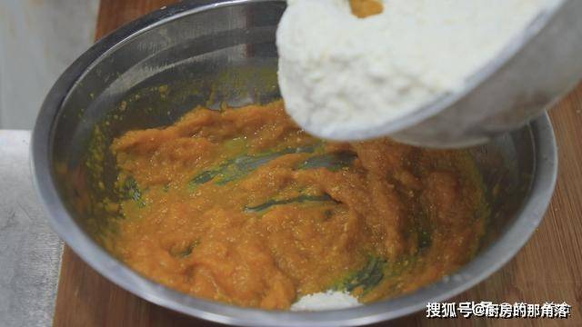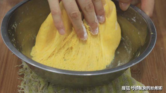 等南瓜泥稍微凉一下,温度不超过30度时,倒入酵母3克,搅拌化开酵母,倒入普通面粉200克,揉成南瓜面团。