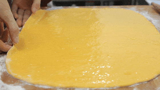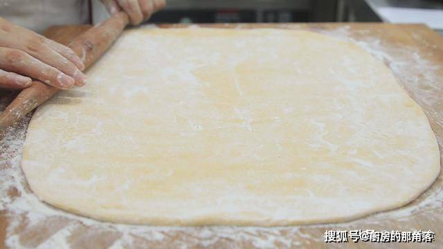 在案板上面撒上面粉 ,取出面团,经过搓揉挤压,压实面团内的小孔,搓揉成一个圆面坯 ,用擀面杖擀成稍厚点的面片。