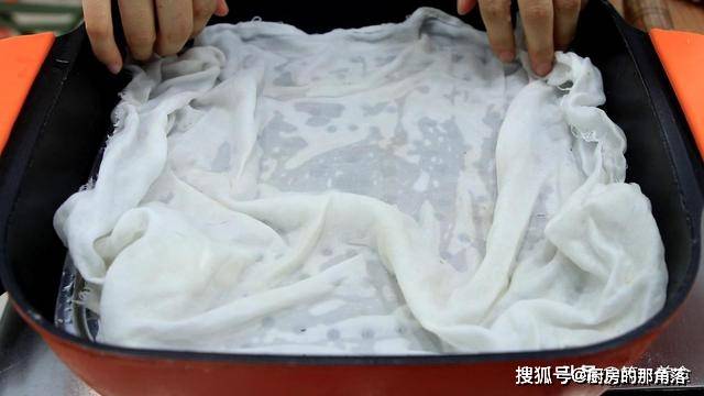 10分钟以后,我们取出电蒸锅,锅热以后铺上一层棉沙布。