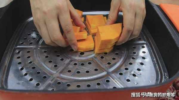 首先,我们准备南瓜一小块,削去外皮,切成小块上锅蒸熟。