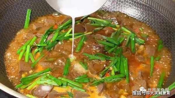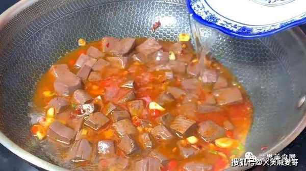 14、继续倒入一勺淀粉水,可以让猪血变得爽滑,这就是炒猪血好吃的秘诀。