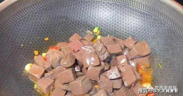 10、接着将猪血倒进去,翻炒十几秒中,给它上色均匀。